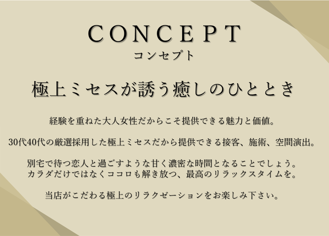 | 当店について | 極上ミセスが誘う癒しのひととき 30代以上の厳選採用 経験豊富なセラピストによる 最高のおもてなしを、 心ゆくまでお楽しみください。 |